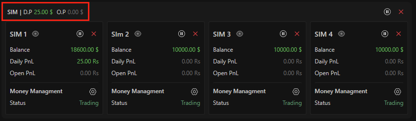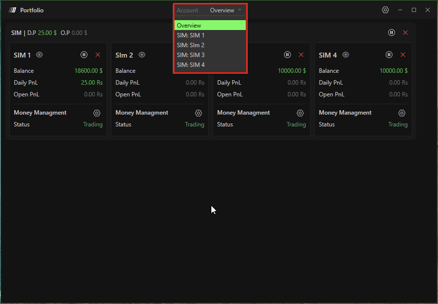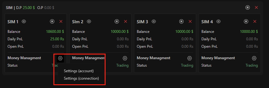 You will see one main card per connection (for example: SIM, Rithmic, Dxfeed).