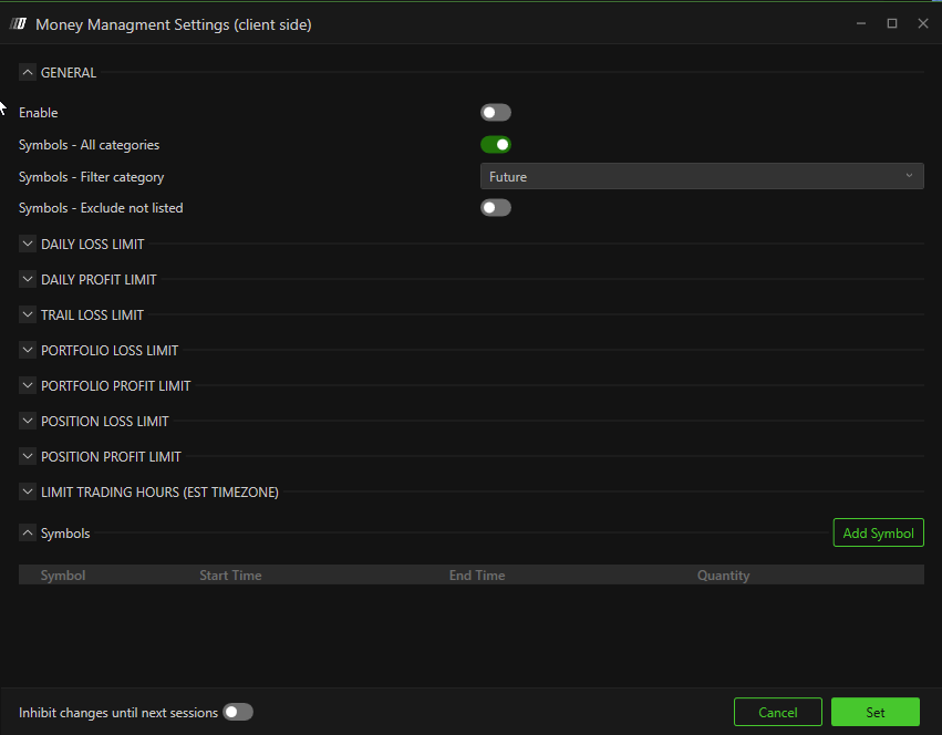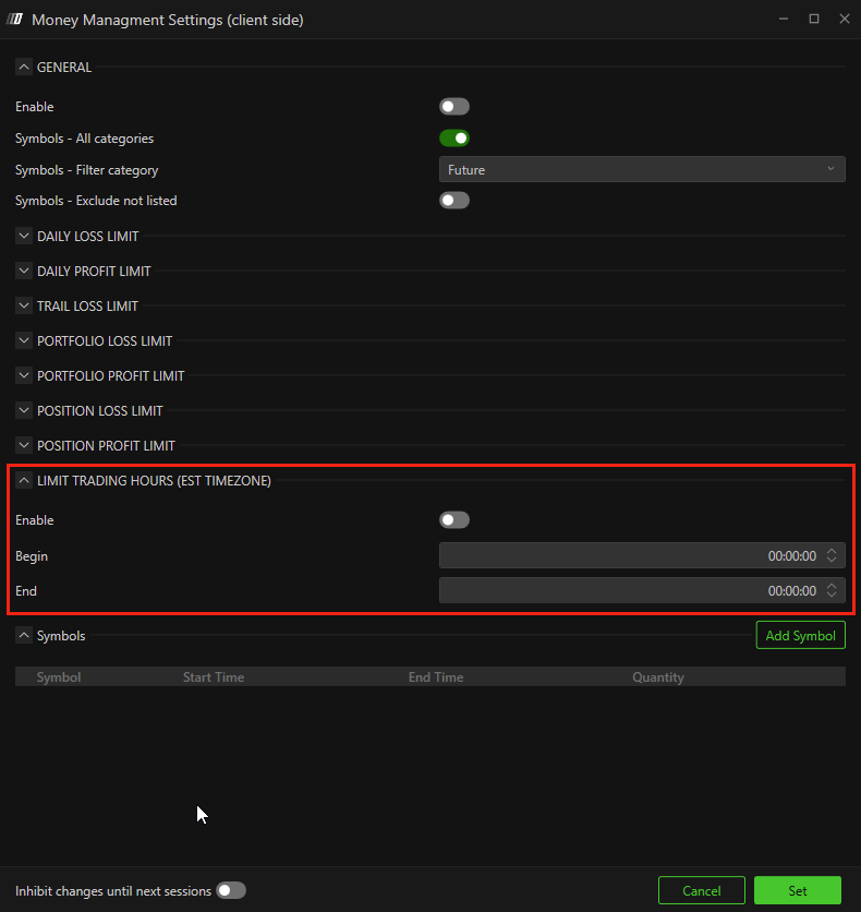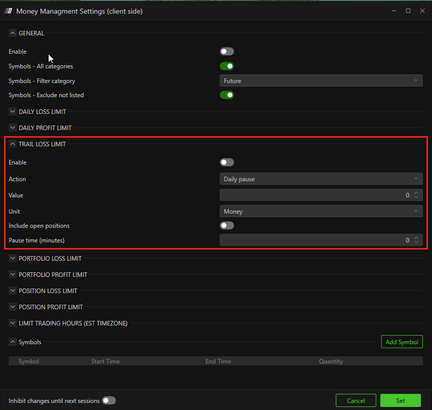 The Risk Manager follows CME timezone (EST) for daily resets.