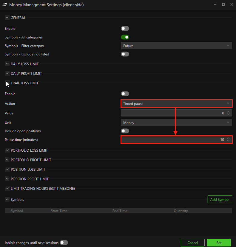 Allows you to pause trading for: