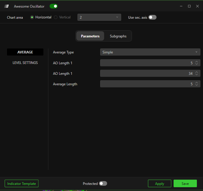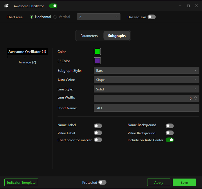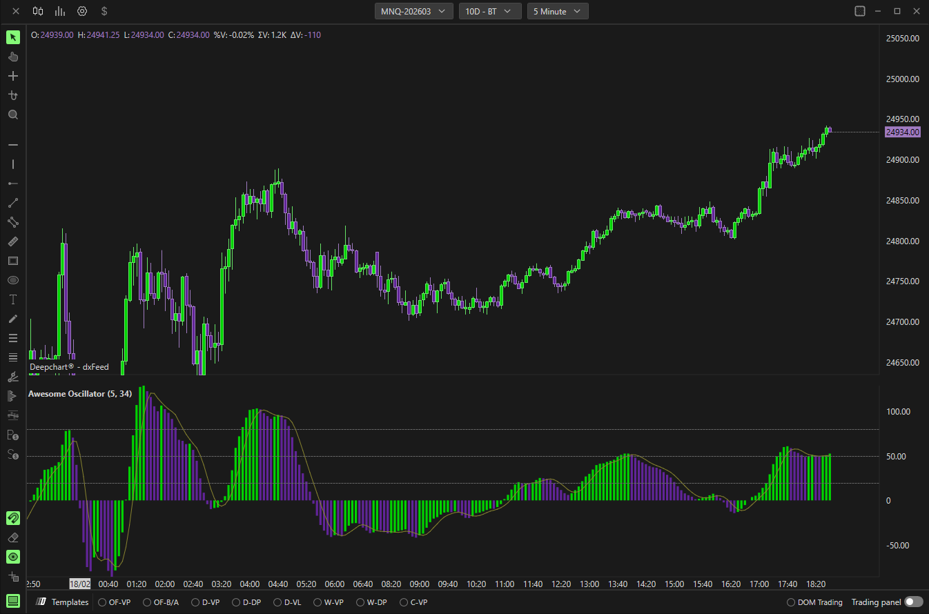 The Awesome Oscillator (AO) measures market momentum by comparing a short-term moving average to a longer-term moving average.