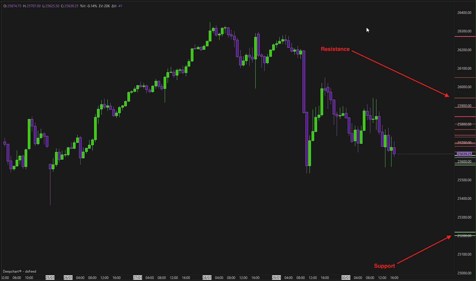 Green zones represent resistance, red zones represent support.