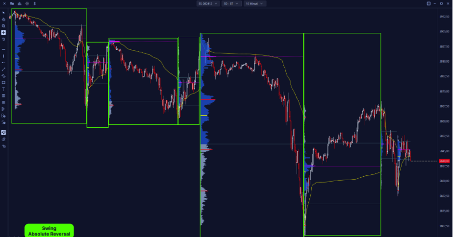 - Swing: When Swing is selected as the length type, the Volume Profile is calculated for each movement characterized precisely by a swing. This type of analysis is useful for identifying volume levels during trend changes, as each swing is analyzed separately, providing an accurate overview of the volume distribution along swings.