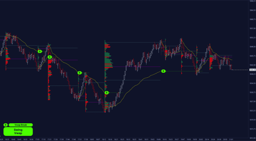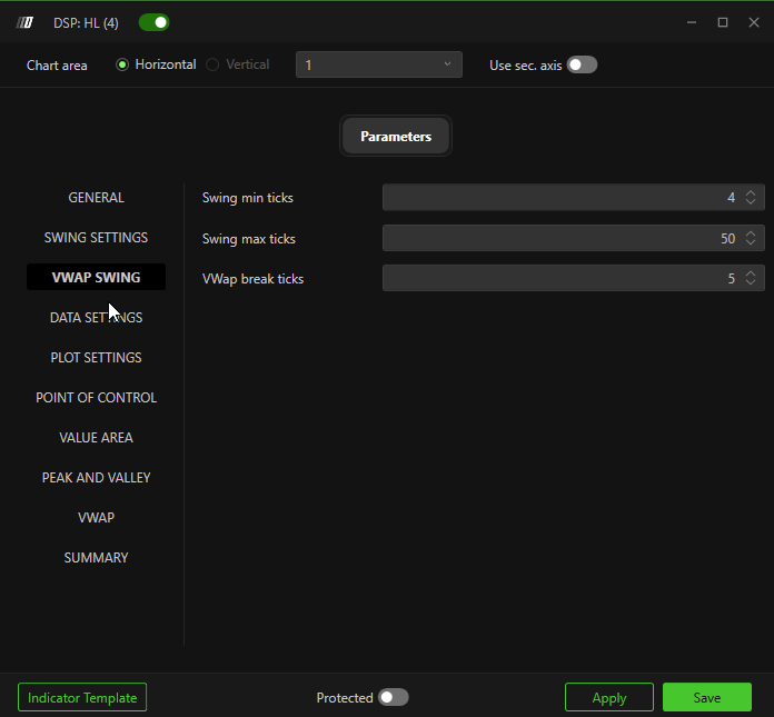 - VWAP Break Ticks: Defines the number of ticks required to confirm the VWAP Break (Break) within the swing. When the price movement exceeds the specified number of ticks for the break, the development of the vwap for the current swing will no longer be plotted on the chart.
