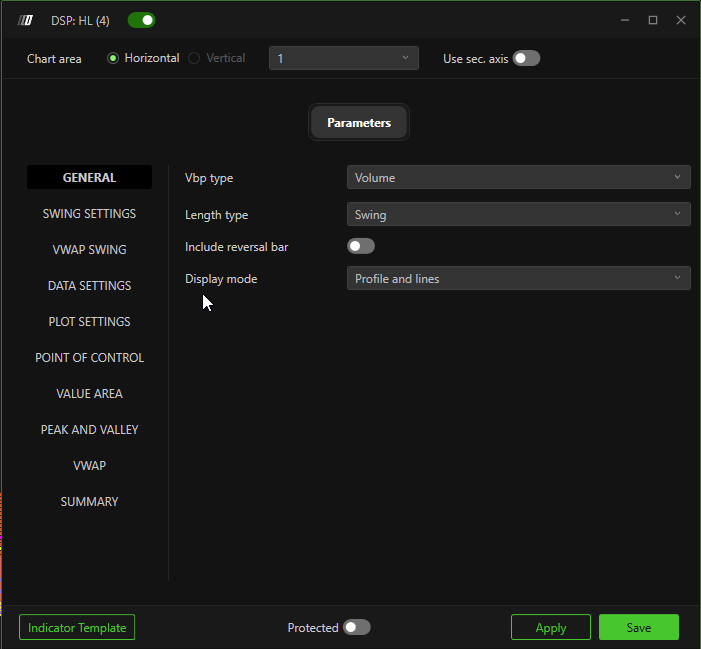 - VWAP: If VWAP is selected as the length type, the Volume Profile is calculated taking into account the VWAP (Volume Weighted Average Price) within the swing.