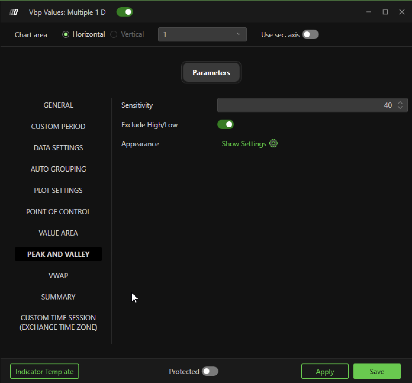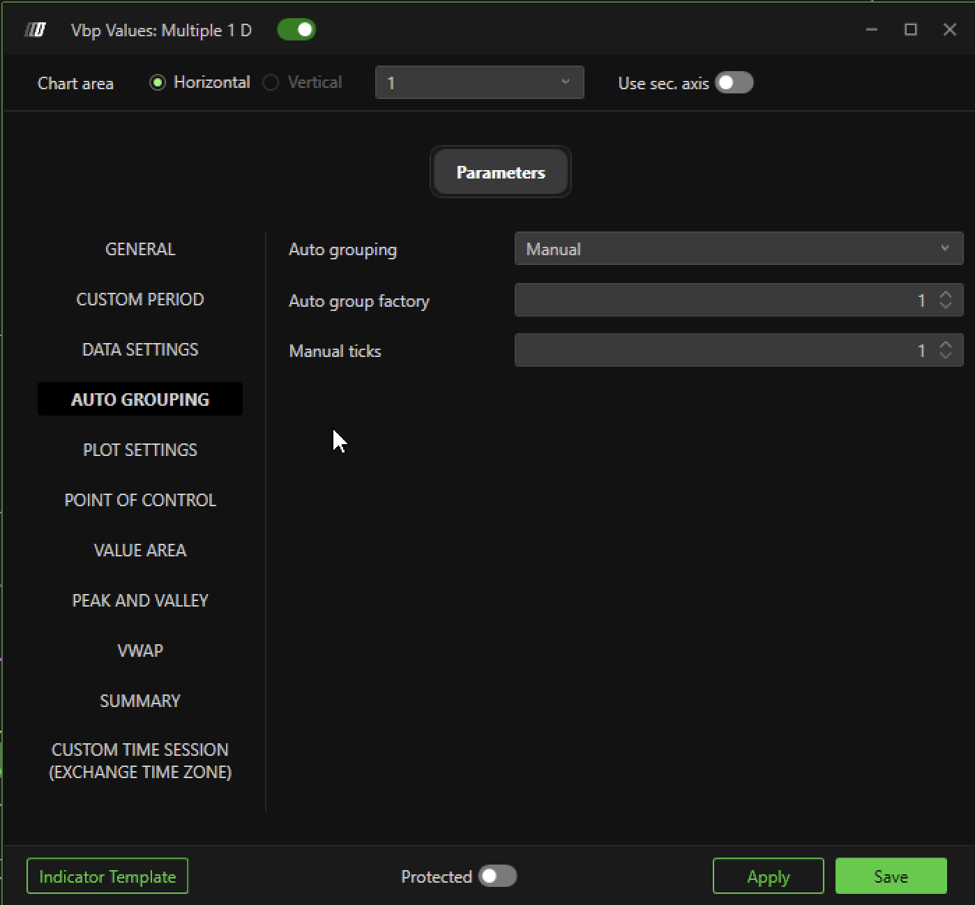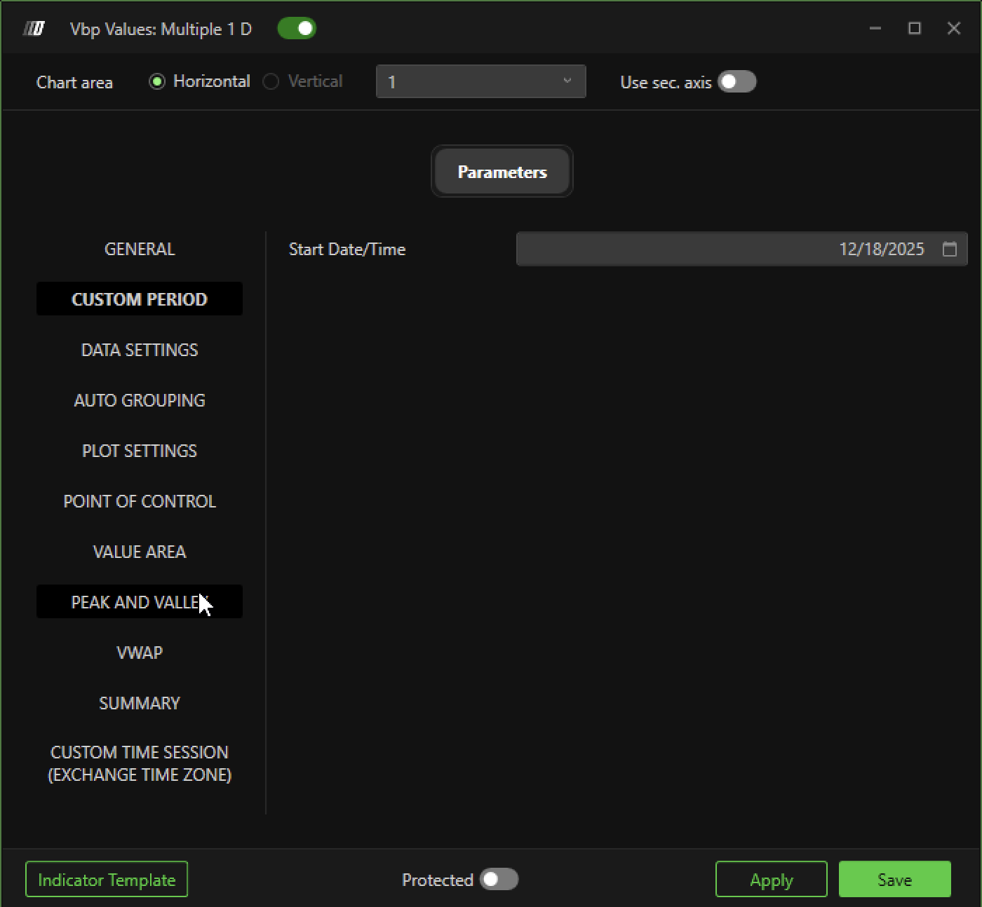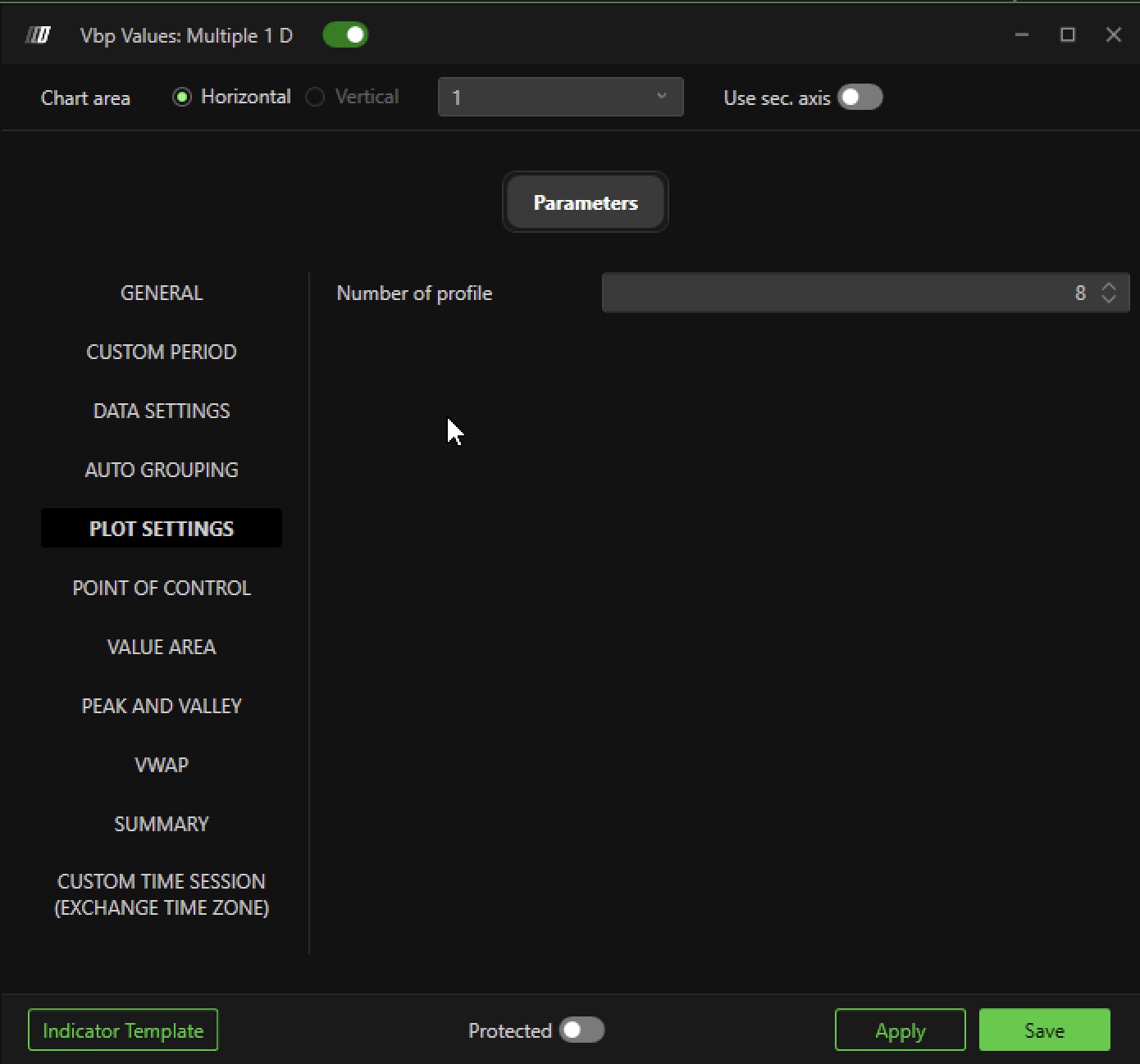 It allows you to select the type of time filter to be applied to the Volume Profile. The filter option allows you to define a specific interval for volume analysis, isolating the desired period or dividing into several periods, e.g. ETH and RTH.