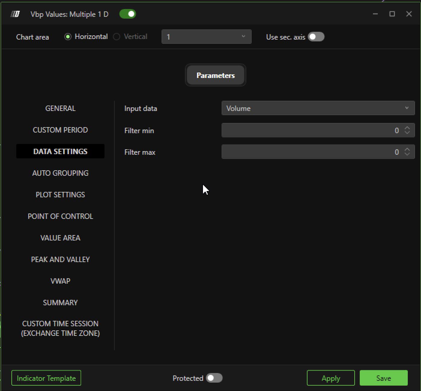 - Filter: Lets you apply a custom temporal filter to limit the volume profile data to a specific period. This mode is useful for analyzing a specific time frame of interest, isolating relevant data.