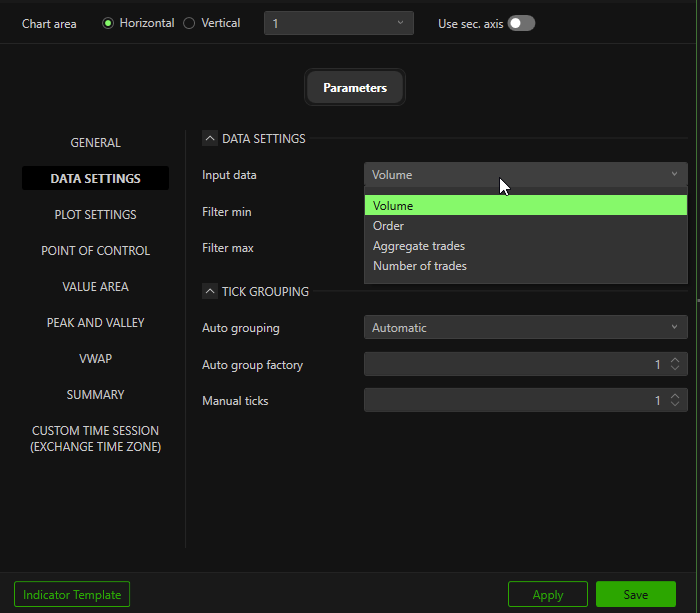 You can choose between Volume, Order, and Aggregate data types.
