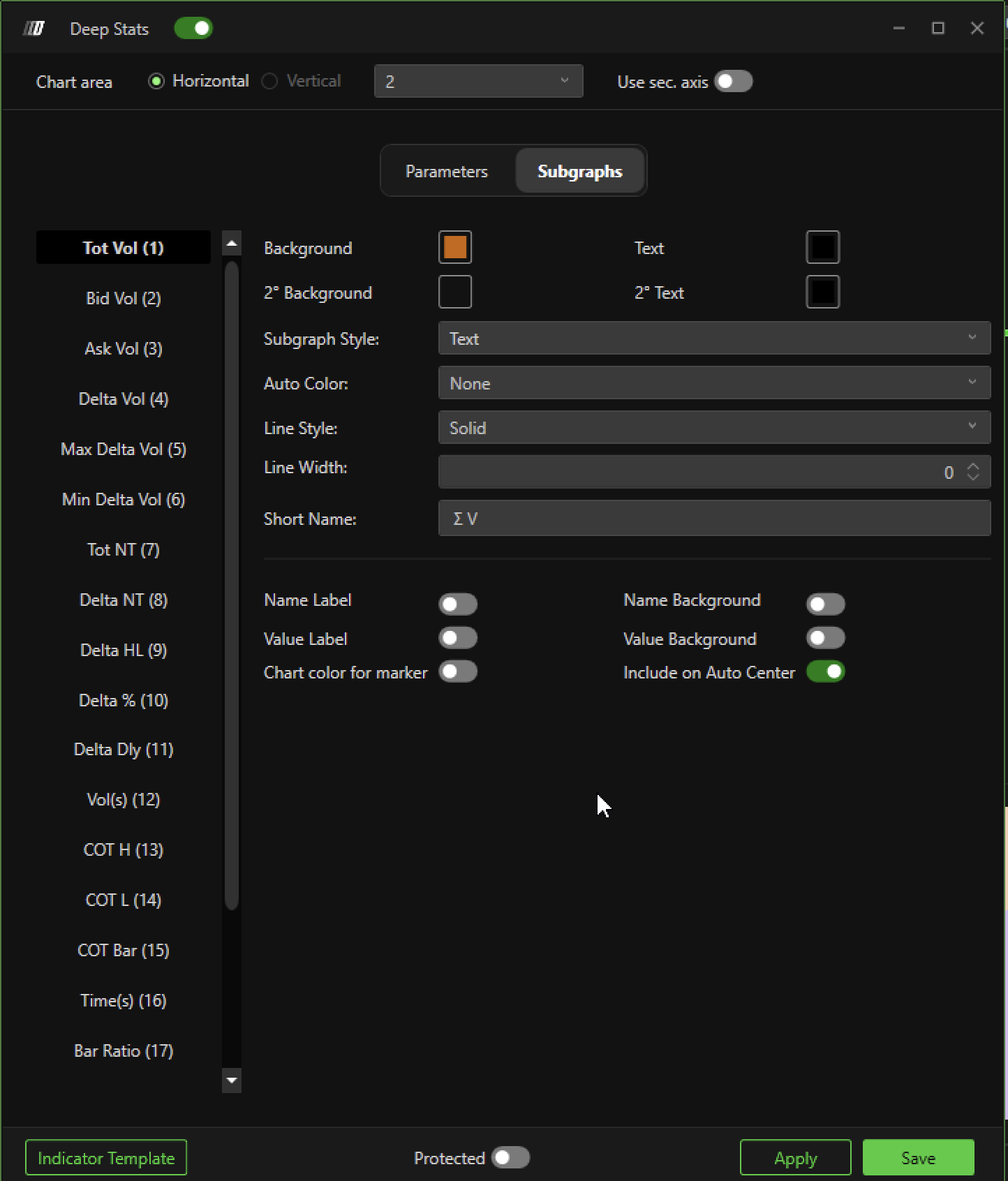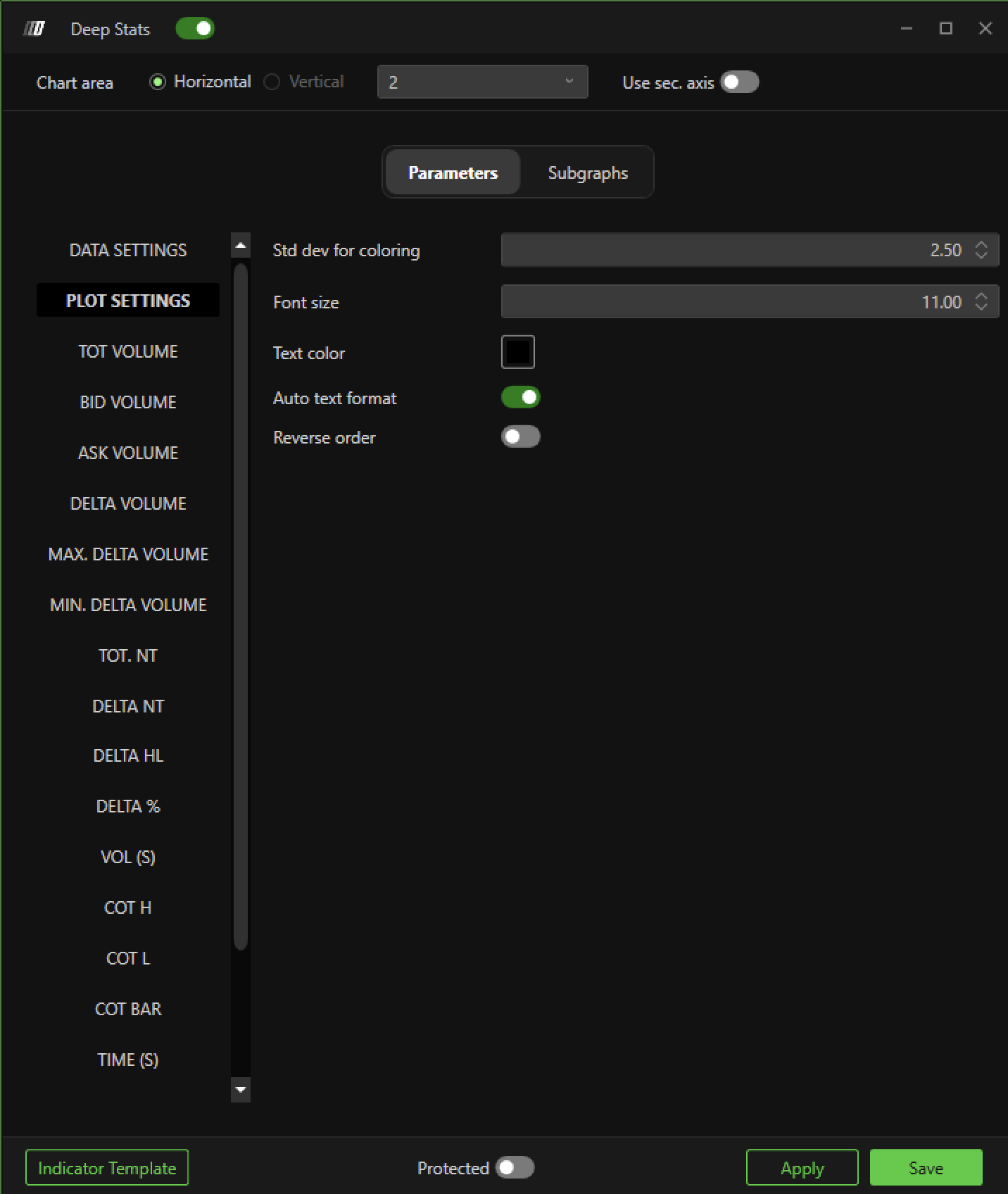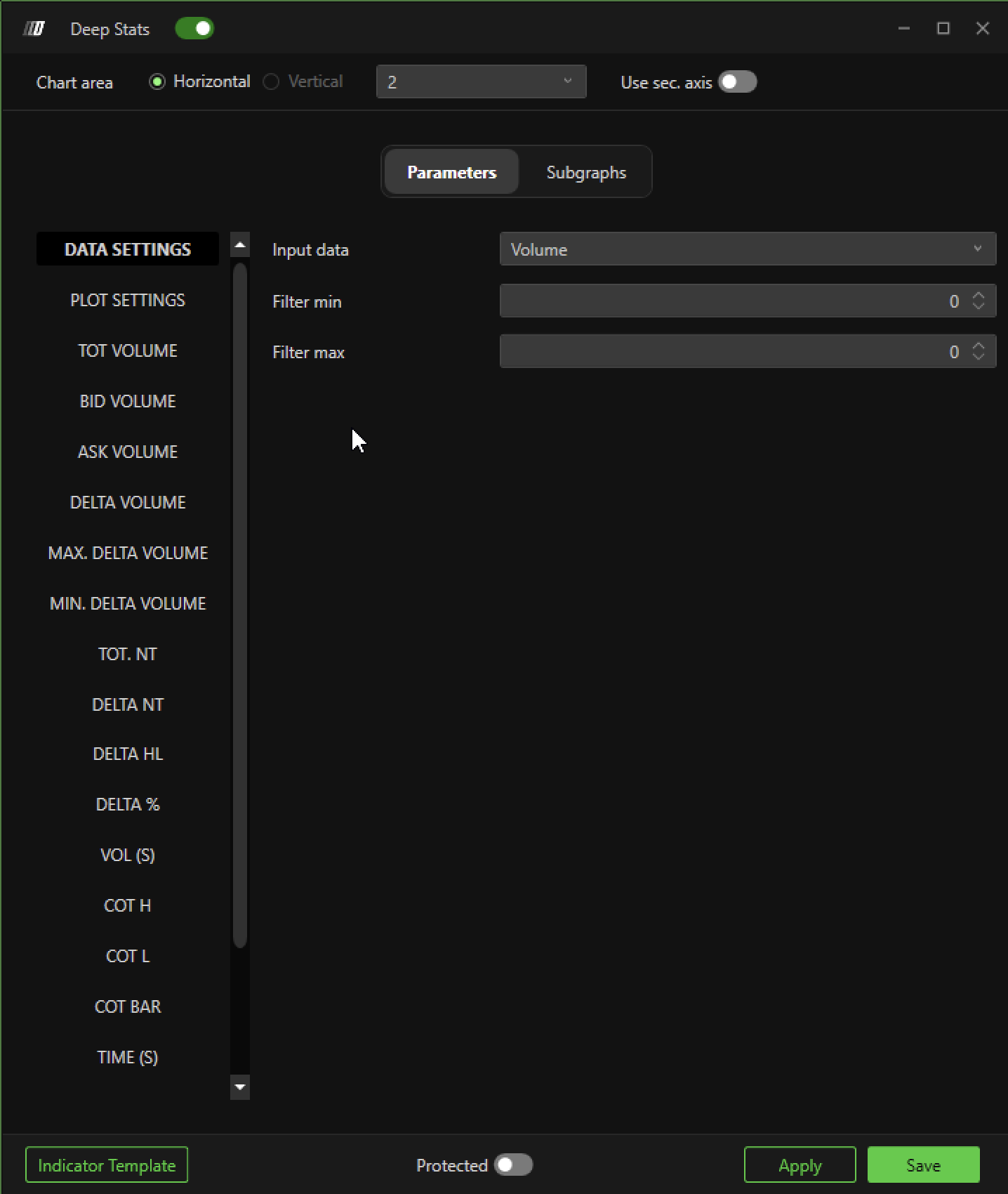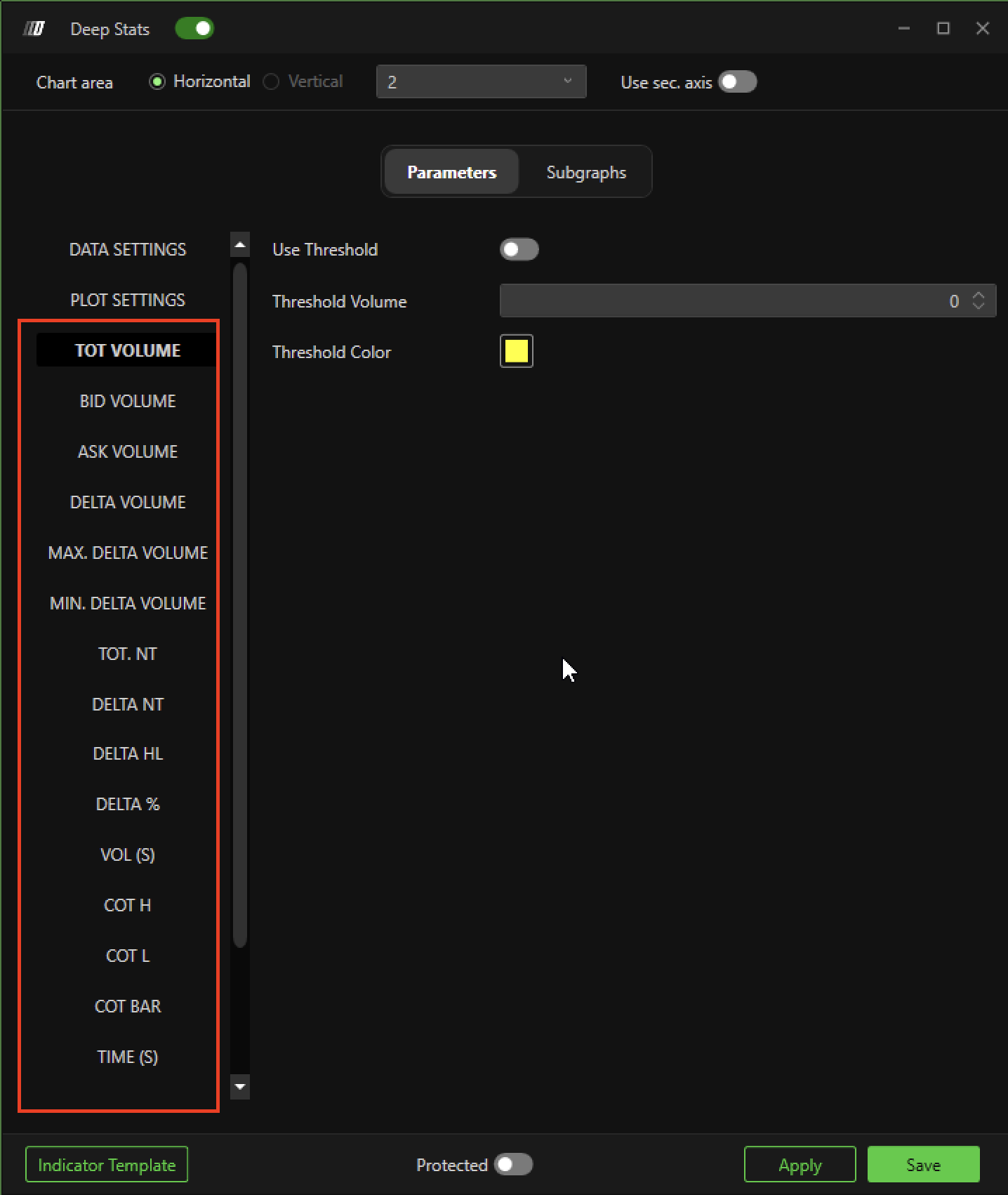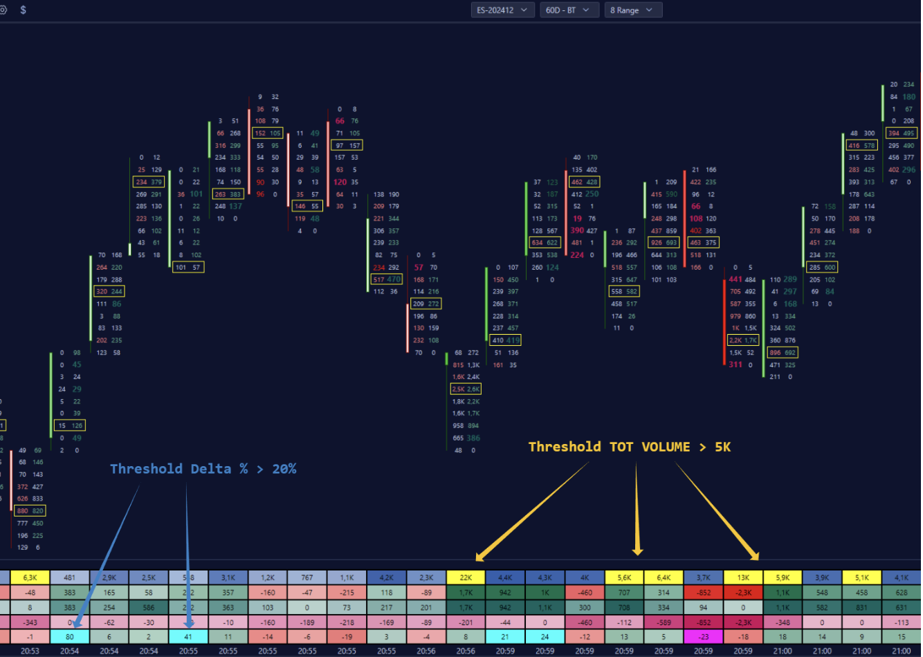 The Deep Stats of Deepchart allows you to display in a multi-level text format of the graph. the main values of each bar, in particular it shows the Total Volumes, the Volumes in Bid, the Volumes in Ask, the Delta Volume, the Max and Min Delta Volume, the Delta % and other Order Flow metrics.