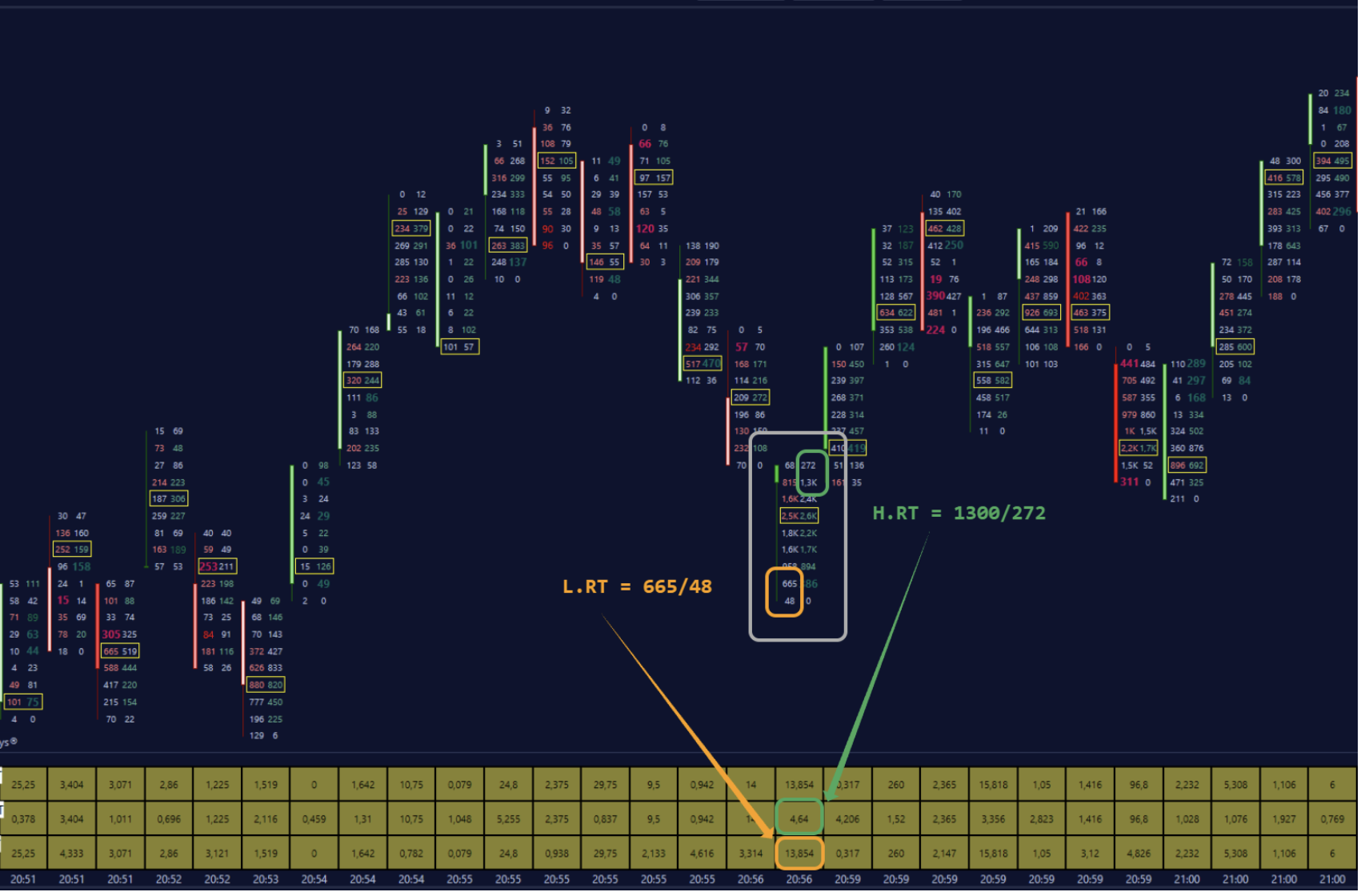 Close Of Trade High, shows the cumulative delta from the'last time the current bar made a low to its Close; under normal conditions the COT H on bearish bars tendà to be negative, when this doesn't happen it means that while the price is falling there è a prevalence of aggressive buyers, signaling a potential absorption of the same.