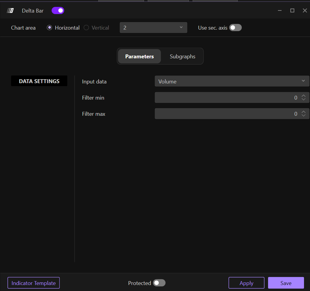 Lets you apply a maximum filter to the indicator. If the value 0 is left, the indicator will not apply any maximum filter. Set a specific value to exclude delta bars that exceed this threshold.