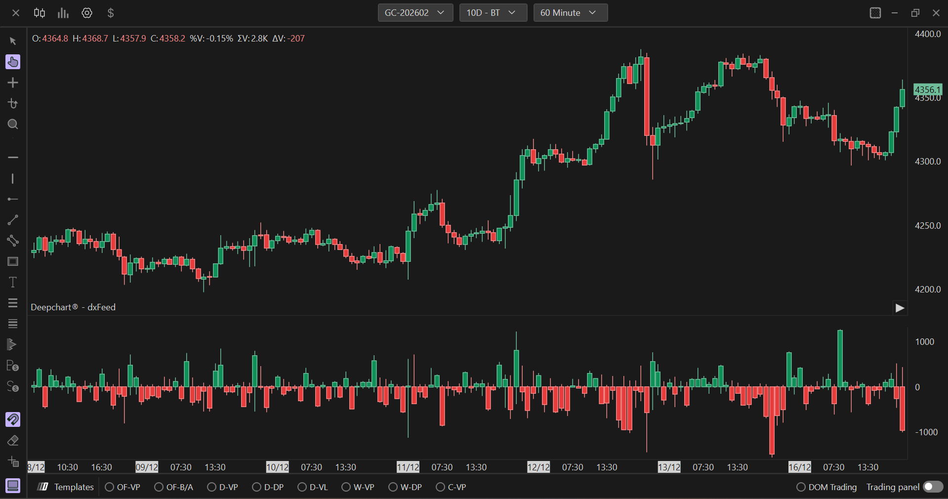 The Delta Bar indicator shows the delta of each candle, i.e., the difference between buy market and sell market, through footer bars on the chart. This allows traders to visually identify market pressure by comparing the volume of aggressive buying versus aggressive selling at each price level.