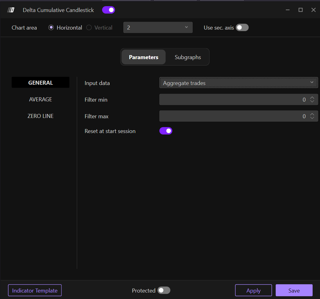 Lets you apply a maximum filter to the indicator. If the value 0 is left, the indicator will not apply any maximum filter. Set a specific value to exclude cumulative delta that exceeds this threshold.