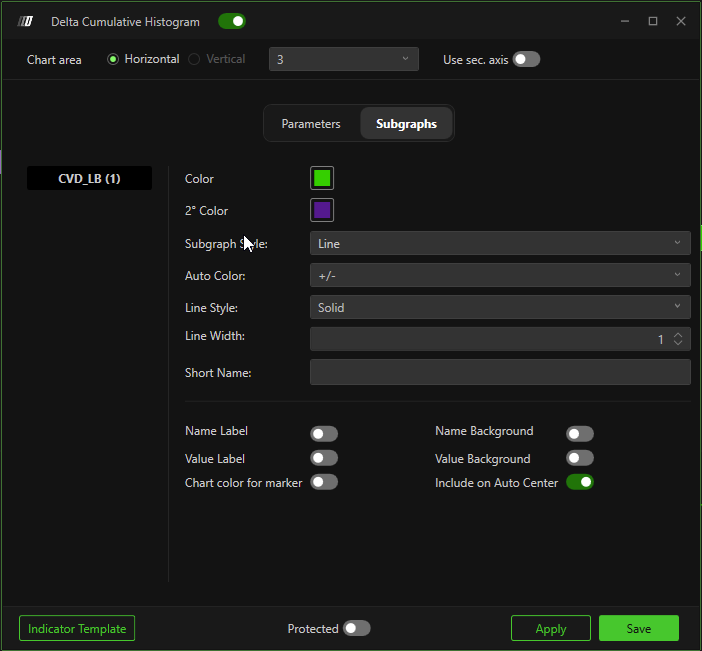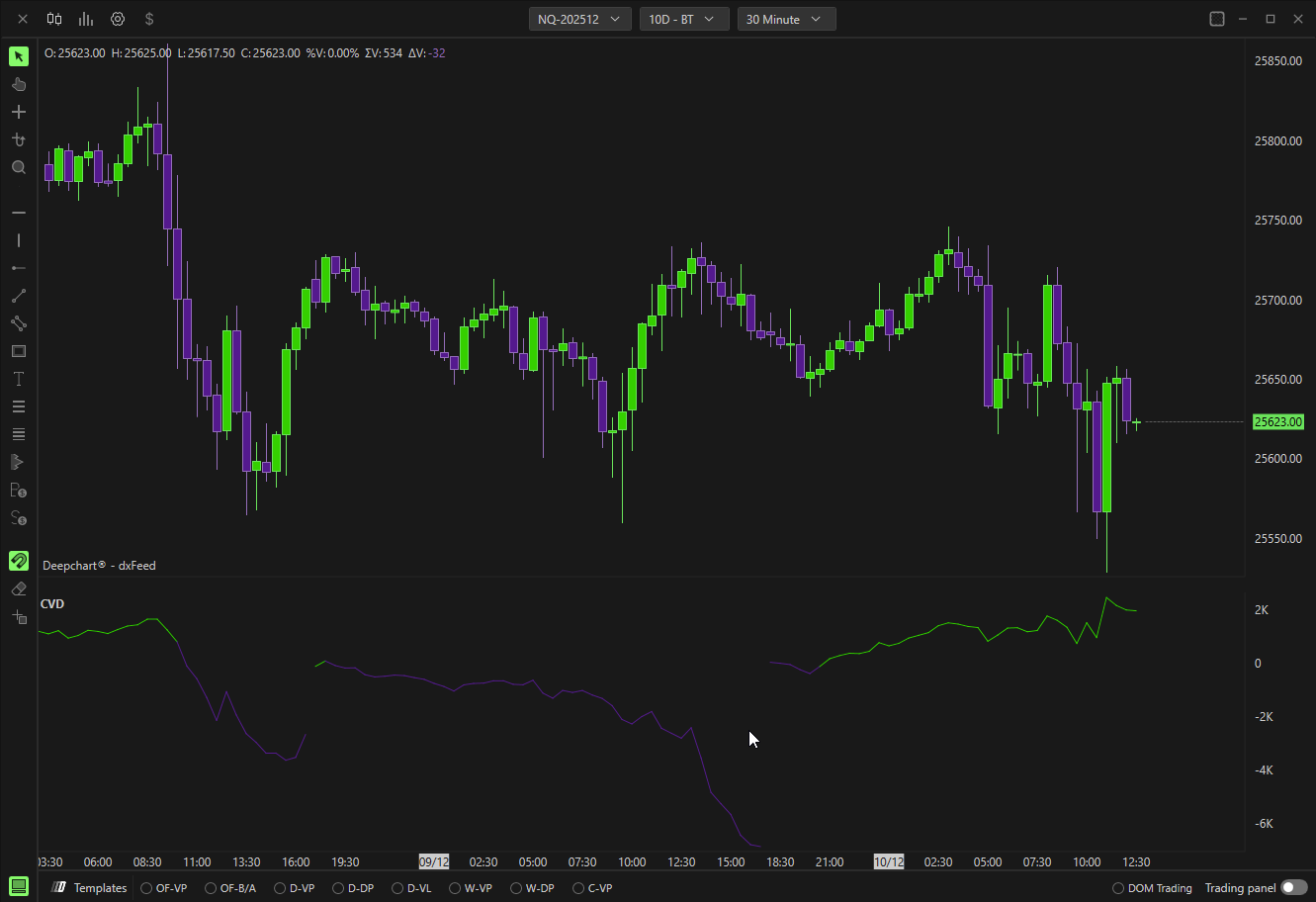 DeepChart Delta Cumulative Histogram indicator allows the user to visualize through bars or a line at the foot of the chart, the cumulative delta summation of each candle's delta, i.e., the difference between sell market and buy market, allowing the user to identify which side of the market is more aggressive.