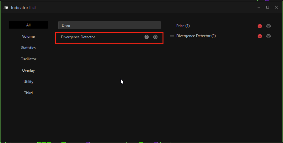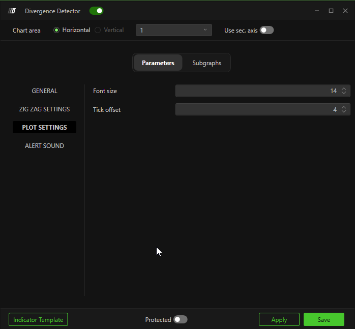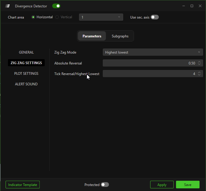 The Divergence Detector indicator for identifying swing points is based on the Zig Zag, which can be set in different ways: