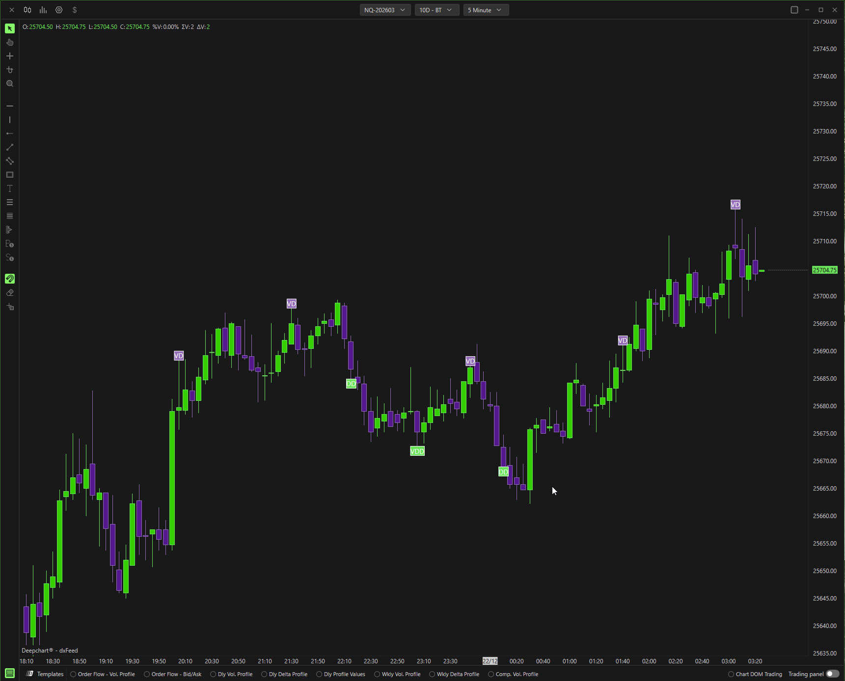The Divergence Detector of DeepChart highlights any volume or delta divergence through the use of labels directly on the chart. The indicator identifies a volume divergence when a new relative high or low is made without a corresponding increase in volume, likewise it identifies a delta divergence when a new relative high or low is made without a corresponding increase/decrease in cumulative delta. Such situations can figure as false breaks, decrying possible reversals.
