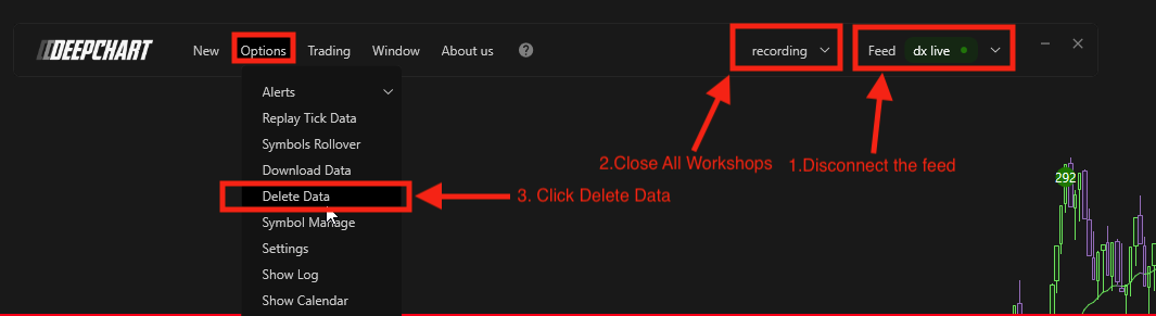 If your charts show incorrect prices, gaps, or stop updating, deleting market data from inside the DeepCharts application allows the platform to re-download fresh data automatically.
