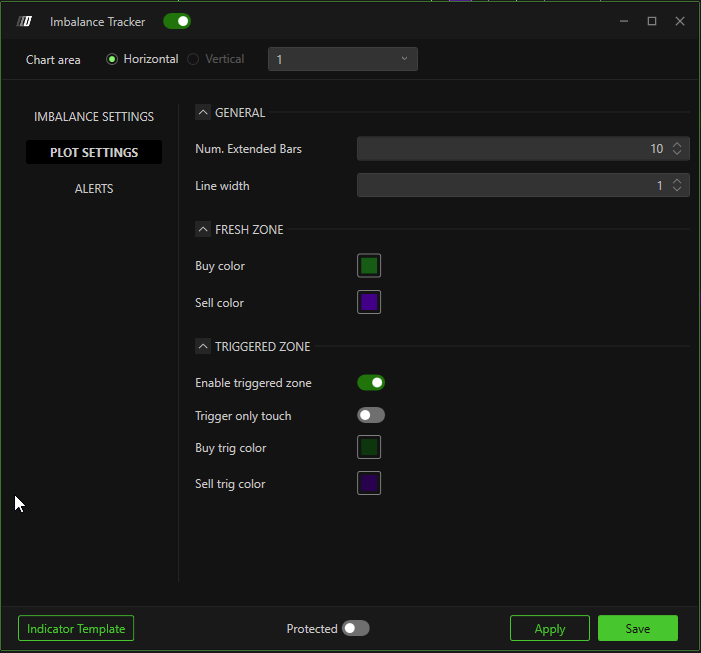 - Line Width: Adjusts the thickness of the line used to highlight imbalance areas. A higher value makes the line more visible, which is useful for easier graphical reading in contexts with multiple layers or in trading environments with high visual activity.