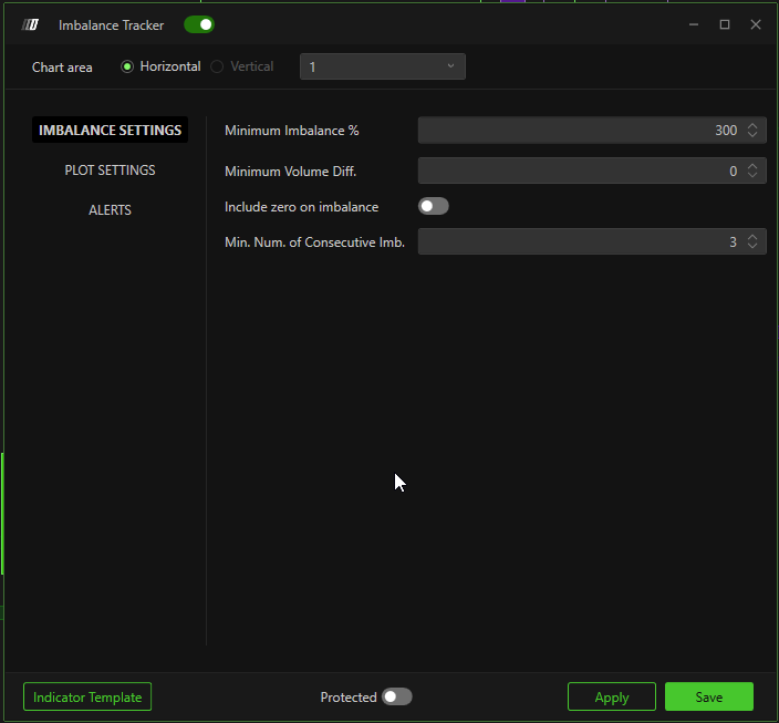 - Minimum Volume Diff: Sets the minimum volume difference between the buy and sell side to detect imbalance. This setting is useful for excluding very small volumes.