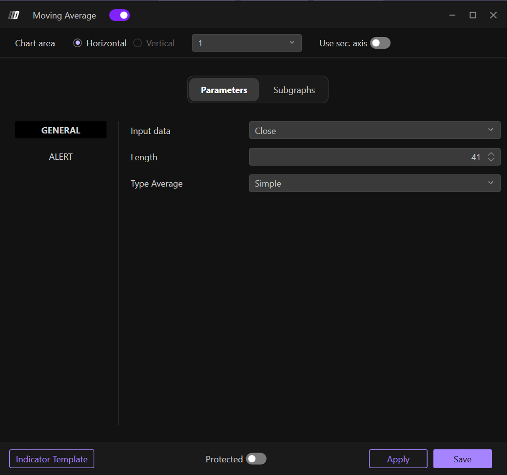 Clicking on the indicator settings icon will open its configuration window, within which you can make several choices regarding the indicator's functionality.