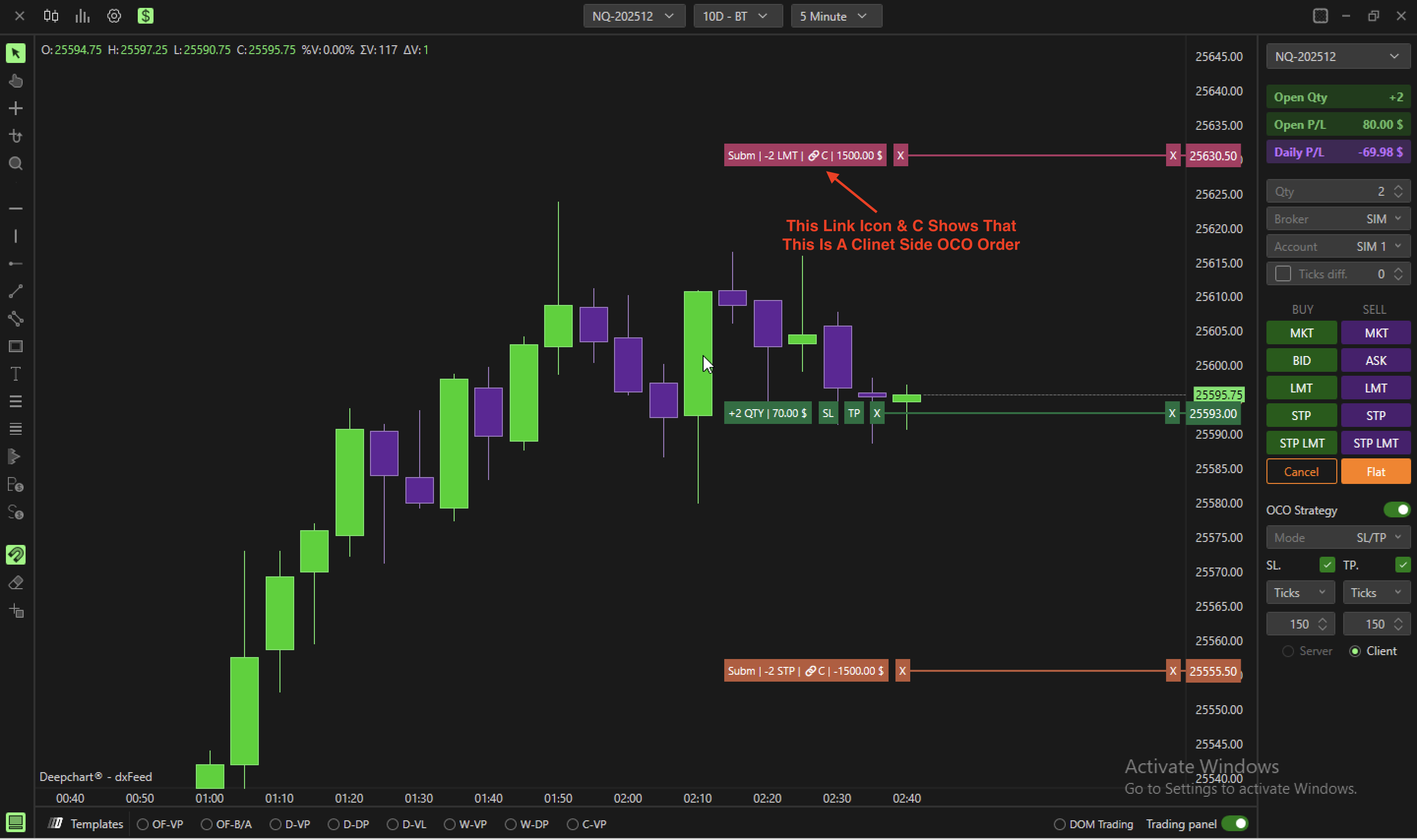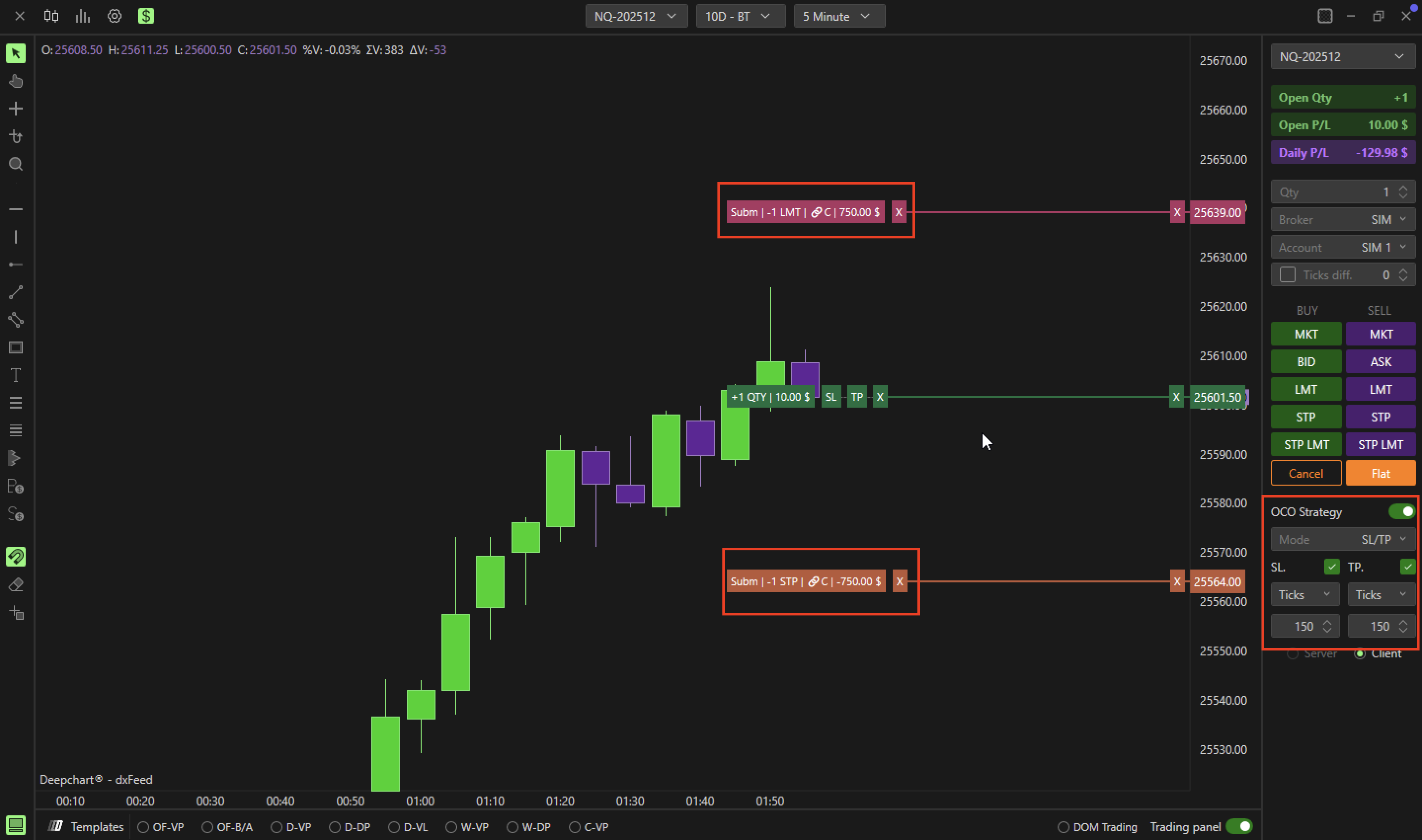 The SL/TP mode allows you to quickly place individual Stop Loss and Target Price OCO orders: