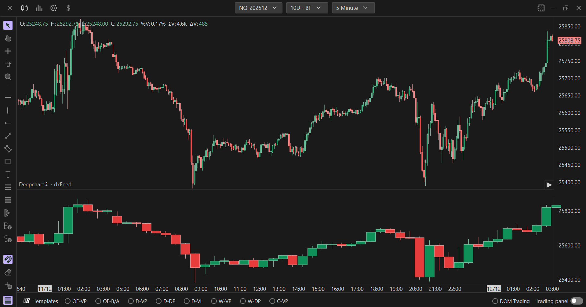 The Deepcharts Overlay Chart indicator allows you to display the chart of another financial instrument on the main chart, allowing you to monitor multiple instruments at the same time. This can be done by creating a secondary chart area or by overlaying the two charts.