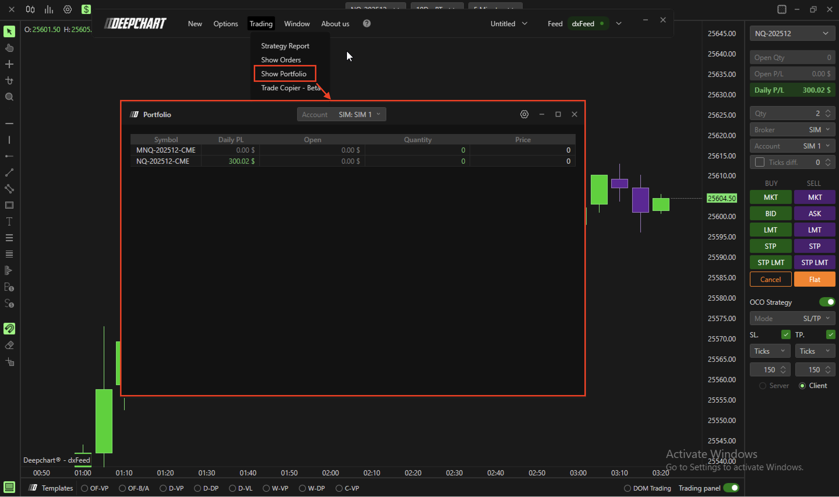 Click on the Trading menu in DeepCharts.