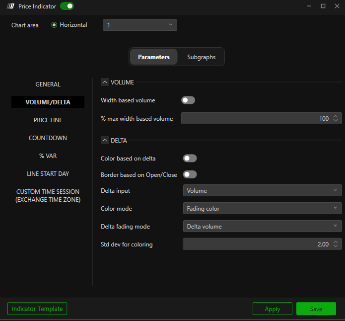 Each chart has a Toolbar in the lower left corner, in which some volumetric indicators are already preset and can be enabled in a very simple way.