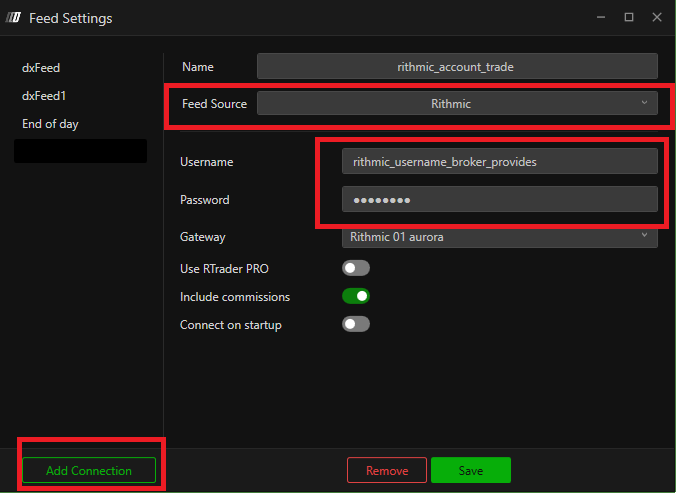 - Check that you have purchased the data feed we provide (ex. DxFeed, Rithmic). Acquire the username and password the broker provides.