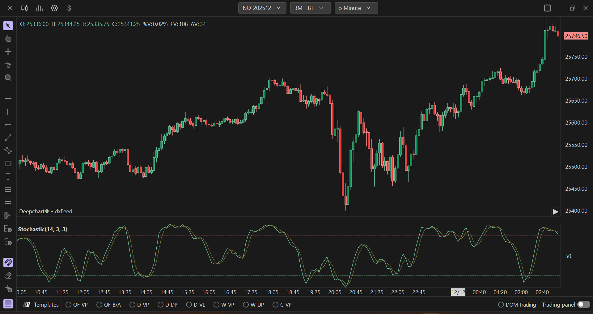 The stochastic oscillator is a momentum indicator, developed by George Lane, that compares the current closing price with the highs and lows of a given number of periods. It is measured in percent. The stochastic oscillator is represented by two lines: