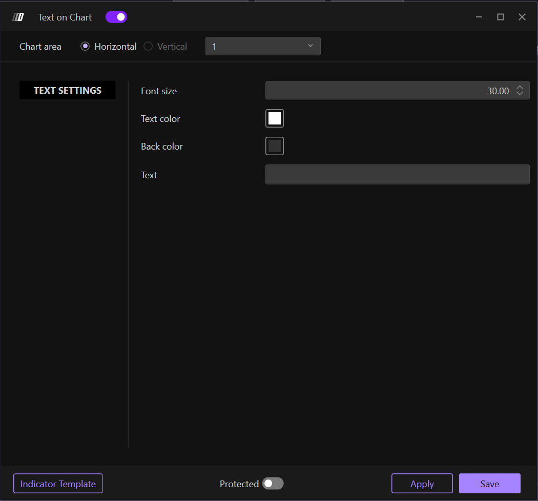 The Text on Chart indicator allows traders to display custom text messages directly on the chart. This simple but powerful tool is useful for adding notes, reminders, trading ideas, market observations, or any custom information that you want to keep visible on your chart for quick reference during analysis and trading.