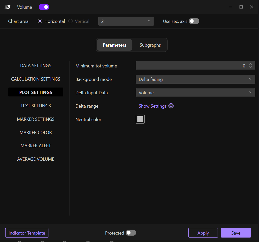 - Diff. Vol: Defines the difference in volume from the maximum peak reached. This setting is useful if you are using seconds-based volume calculations, allowing you to view any volume pullbacks or retracements.