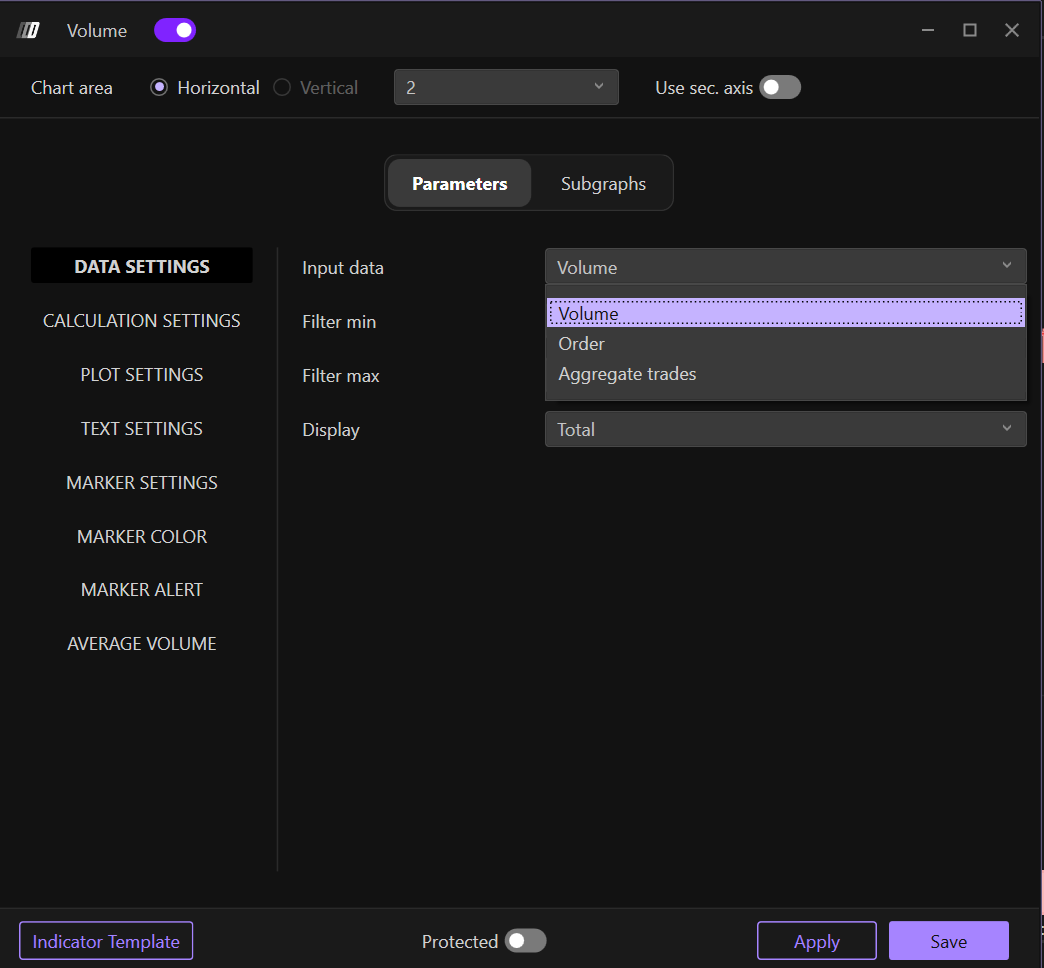 - Volume Max: Defines the maximum minimum volumes that the bar has reached. Marks bars exceeding this threshold.