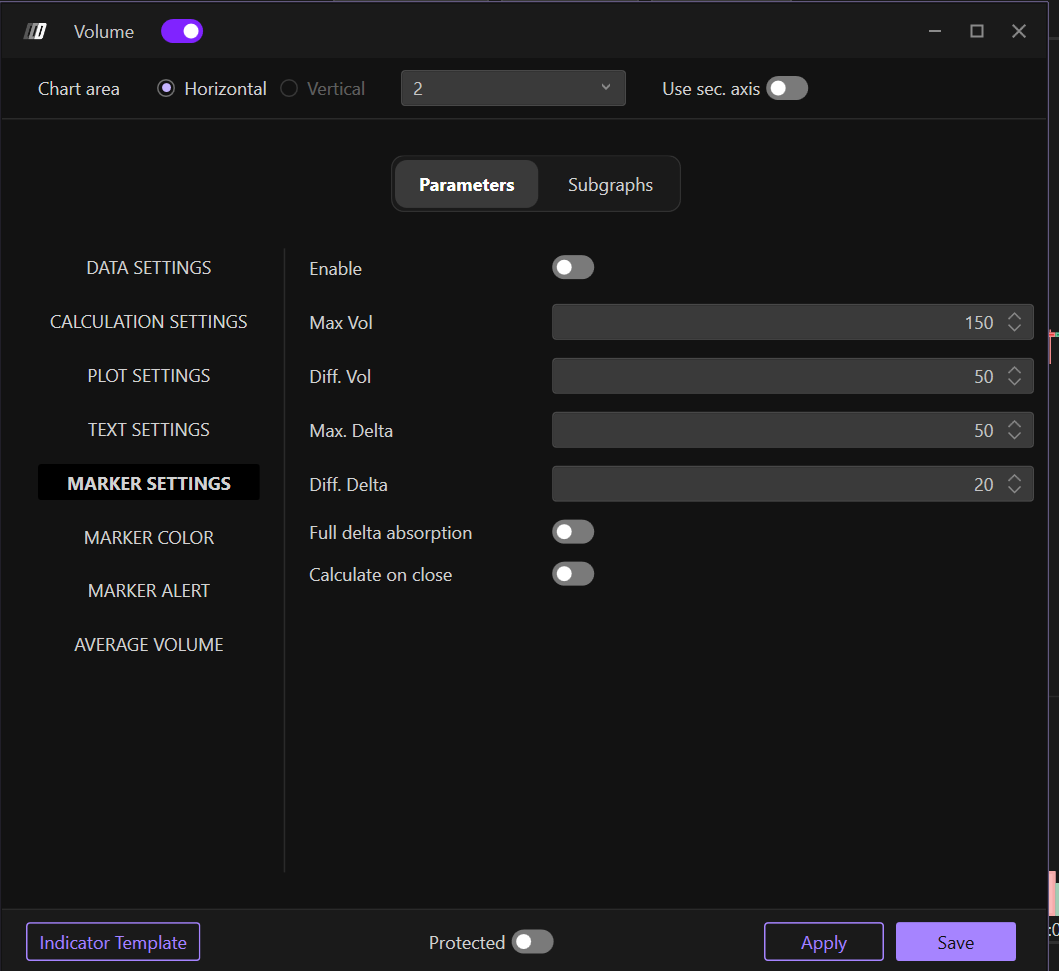 Allows you to enable graphical markers when certain conditions are met, helping identify bars with significant volume or delta behavior: