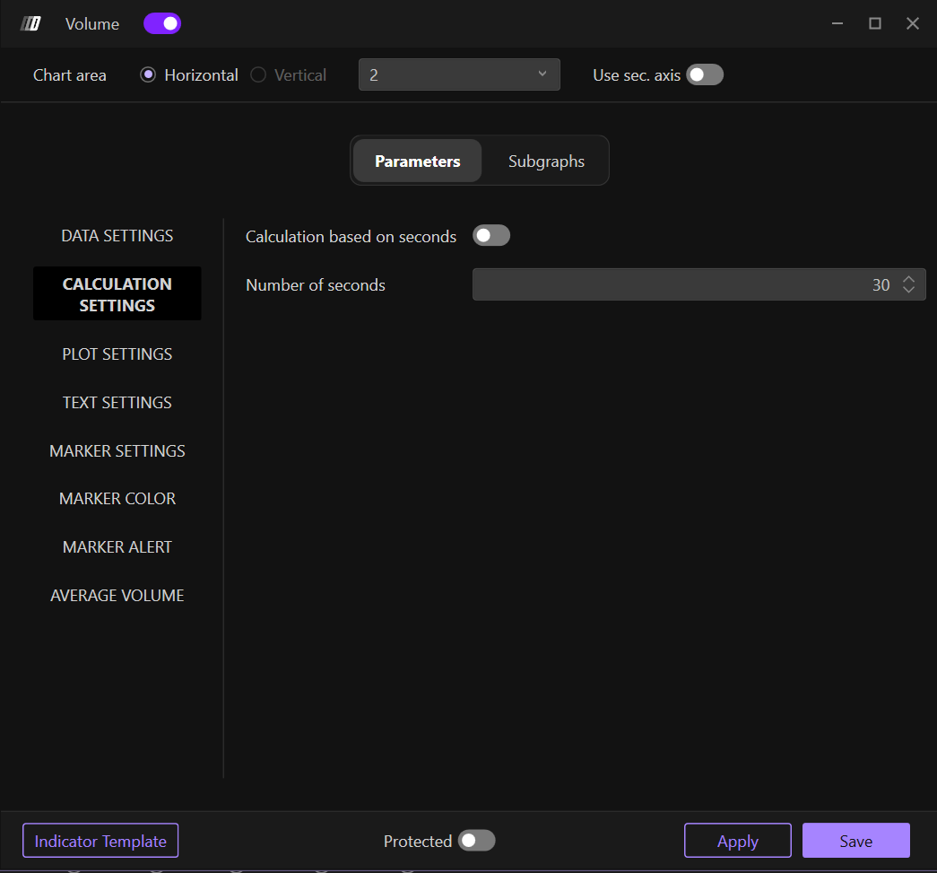 If enabled, it allows volume to be calculated based on seconds. This option is particularly useful in range graphs to highlight any accelerations or decelerations in trading speed.